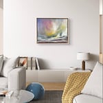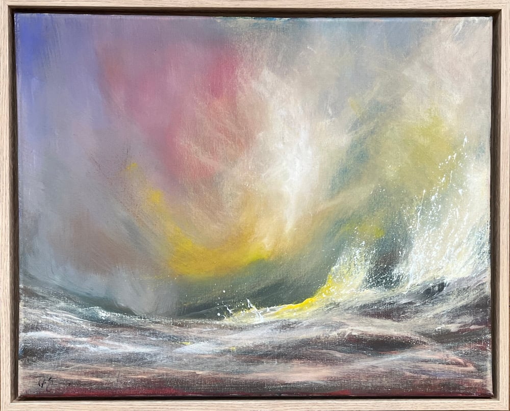 The oil painting captures a breathtaking scene, measuring 54x44 cm framed elegantly in an oak tray frame that complements the vivid colors. The sky is a mesmerizing blend of purple, red, and yellow hues, swirling together in a dramatic display reminiscent of the aurora borealis. Below, the dark, rough sea contrasts sharply with the vibrant sky, its turbulent waters reflecting hints of the colorful light above. A white wave sprays dramatically, adding a sense of movement and energy to the composition. The overall effect is one of awe-inspiring beauty, evoking the power of nature and the ethereal quality of the auroras.