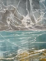 This ethereal oil painting captures a tranquil seascape, reflecting the stillness of a late autumn day. The scene is imbued with a cold ambiance, as delicate layers of frost cling to the shoreline, subtly shimmering in the focused light that breaks through the muted clouds above. Soft waves gently lap at the coast, their edges adorned with wisps of sea foam that dance in the gentle breeze. The color palette features cool blues and grays, evoking a sense of calm and introspection, inviting viewers to pause and absorb the serene beauty of nature's quiet transition toward winter.