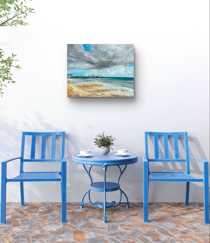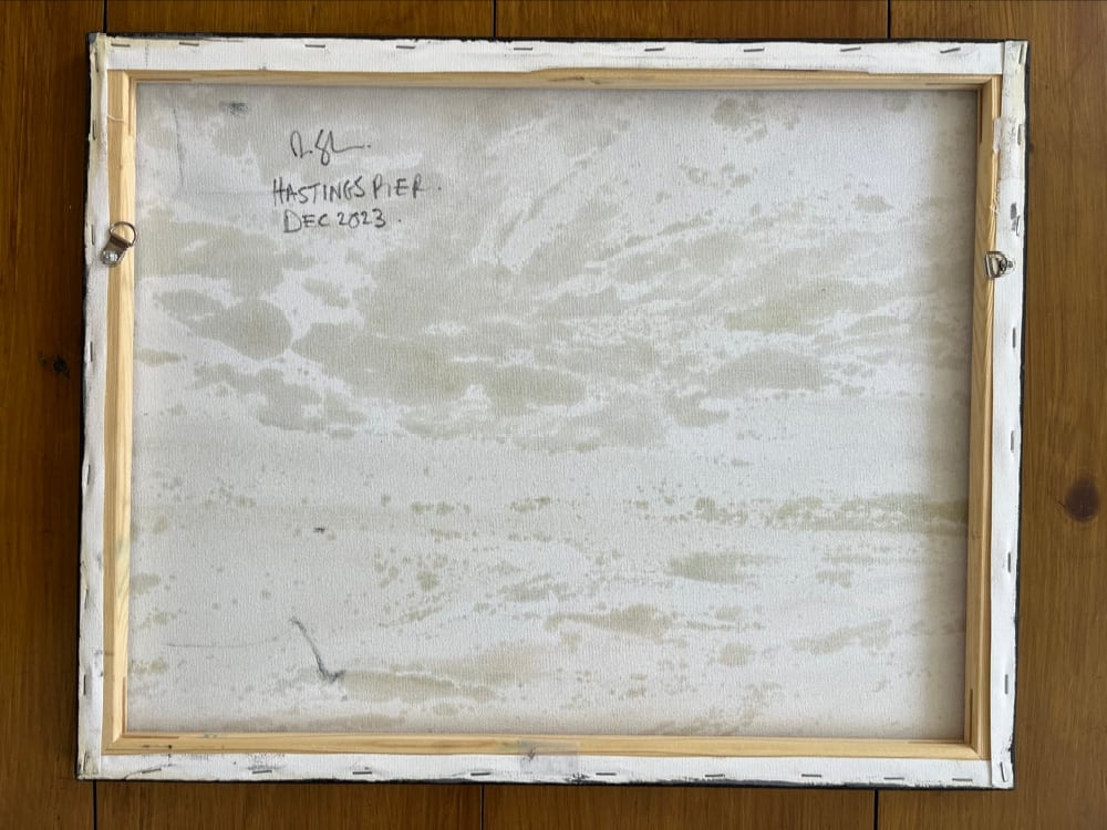 Dark, heavy, winter clouds hang over a crisp, bright blue day along Hastings Beach.
