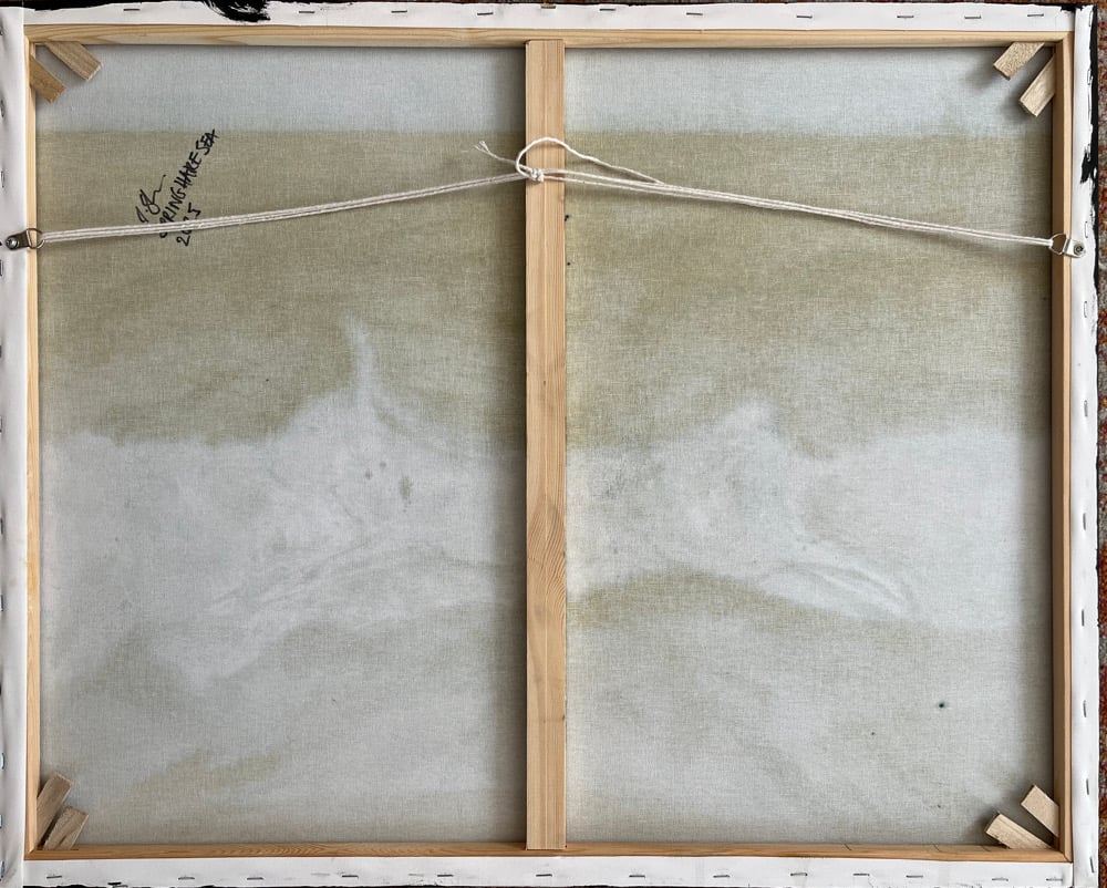 An expressionist painting, with a nod to the seasonality evident in the Spring wave resembling a Spring Hare.