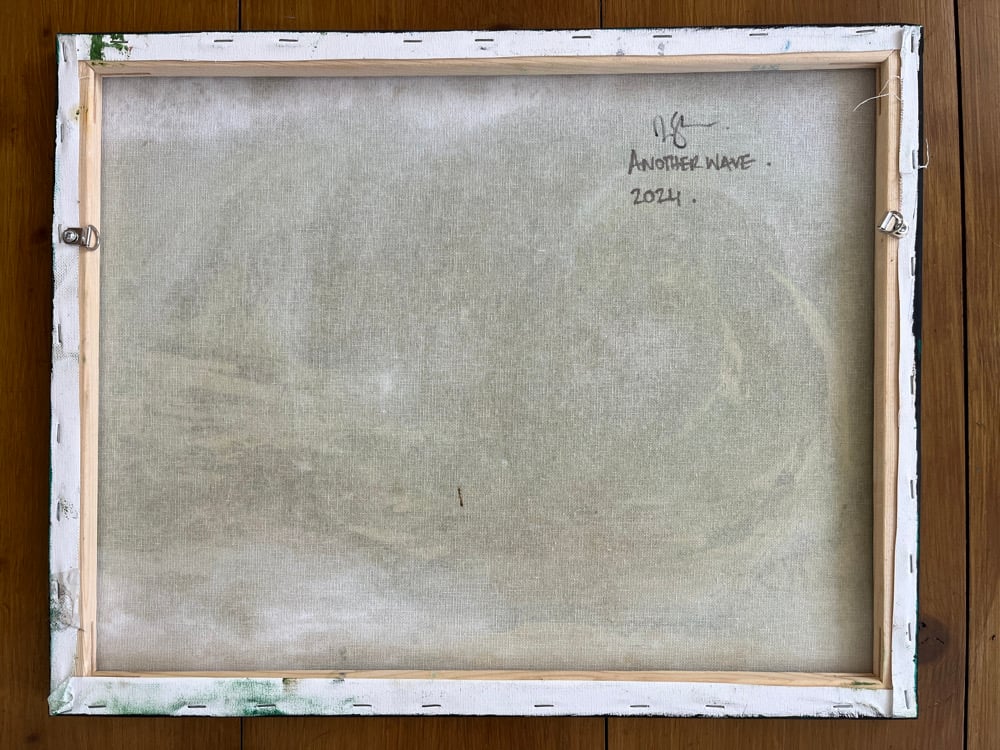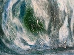 This striking oil painting showcases the dynamic power of the ocean through its heavily textured strokes that bring the scene to life. A massive rolling wave dominates the canvas, its curves captured in vivid blues and greens, creating a sense of movement and energy. The wave crashes dramatically, sending sprays of ocean mist into the air, depicted with brilliant white highlights that contrast against the deep colors of the water. The raw energy and vitality of the sea are palpable, drawing the viewer into the tumultuous beauty of nature's forces at play.